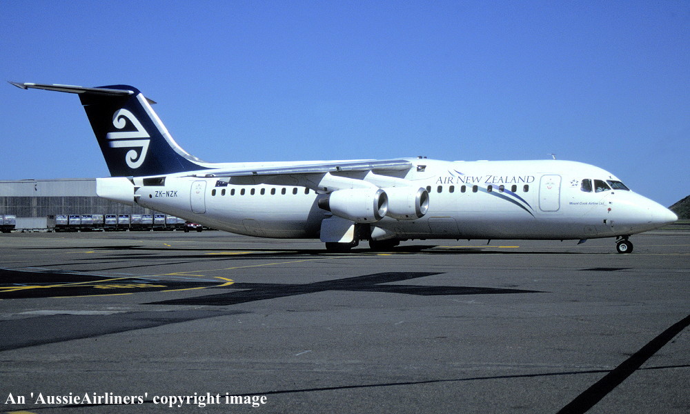 ZK-NZK. Air New Zealand - in the 'Pacific Wave' livery with additional 'Mount Cook Airlines Ltd' titles at Wellington Airport, November 2001. (R. N. Smith Collection Copyright Image 0414-110.) |