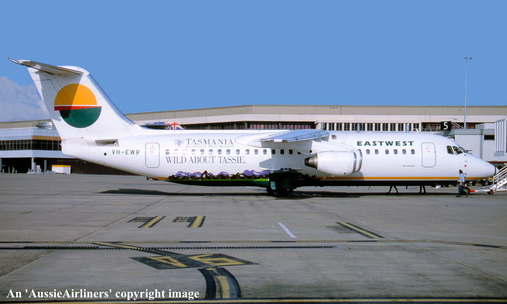 VH-EWR. EastWest - in the standard livery with additional 'Wild About Tassie' decals at Melbourne Tullamarine Airport, October 1992. (R. N. Smith Copyright Image 0414-163.) |