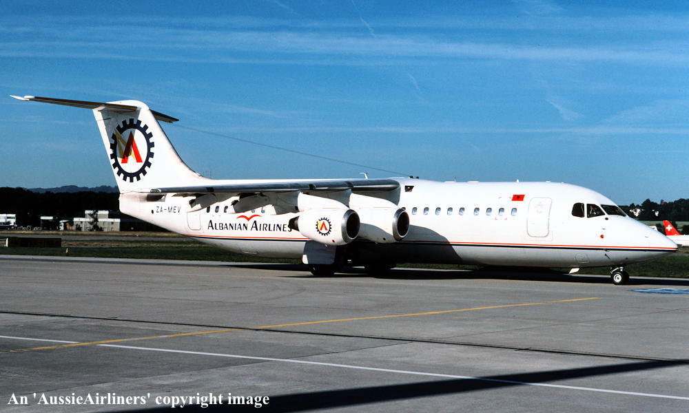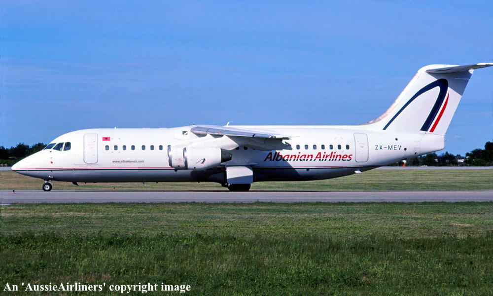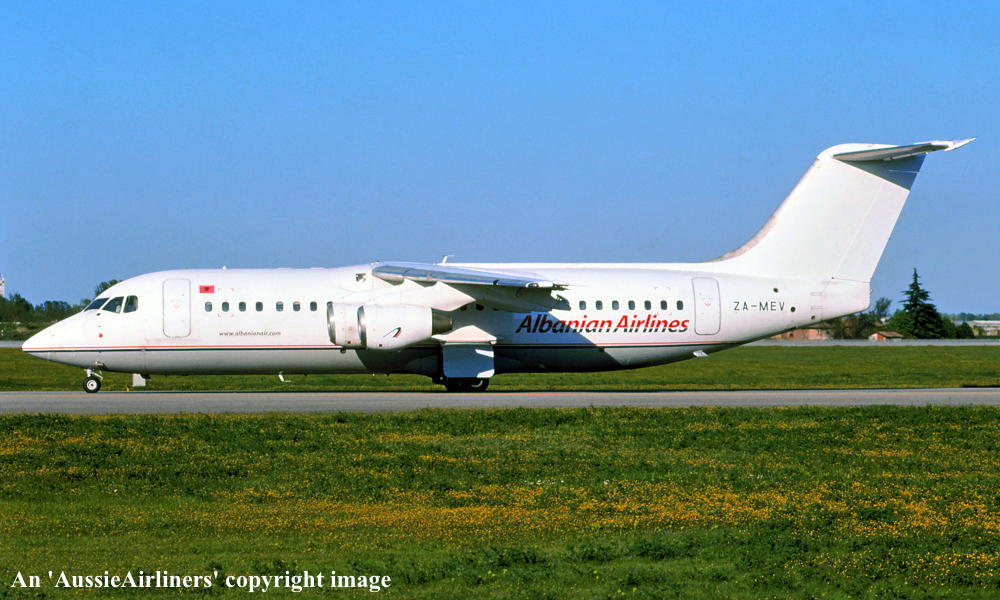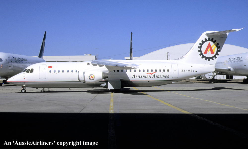 This aircraft was built at the British Aerospace Hatfield plant for East-West Airlines order First flown at Hatfield as 'G-6-197' - June 27, 1991 Entered onto the Australian Aircraft Register as VH-EWS - June 29, 191 Registered to East-West Airlines (Operations) Pty Ltd It was configured to seat 94 economy class passengers Departed Hatfield on the delivery flight to Australia - June 30, 1991 It arrived at Tamworth on completion of the delivery flight - July 04, 1991 Delivery route: Hatfield - Italy - Egypt - Yemen - Oman - India - Thailand - Singapore - Indonesia - Darwin - Tamworth Operated its first revenue service Sydney (Kingsford Smith) - Coolangatta - July 11, 1991 Withdrawn from East-West service - January 04, 1993 Repainted into the Ansett Australia 'Union Jack' livery at Melbourne (Tullamarine) Entered service with Ansett Australia - January 17, 1993 Operated the first Ansett BAe146-300 service on the Melbourne - Hobart - Melbourne route - February 01, 1993 Registered to Ansett Transport Industries (Operations) Pty Ltd, Melbourne - March 17, 1994 Operated the final Ansett Brisbane - Norfolk Island - Brisbane service as AN845/844 - March 27, 1997 Flight crew: Captain G. Backhouse Operated its final revenue service Cairns - Brisbane as AN159 - July 28, 2001 It was undergoing heavy maintenance at Brisbane when Ansett ceased operations - September 13, 2001 It was offered for immediate sale having flown 26,195 hours with 21,484 cycles - October 25, 2001 Stored in the Ansett hangar at Brisbane Airport Ferried Brisbane - Melbourne (Tullamarine) as AN4040 - August 16, 2002 Flight crew: Capt. S. Henderson; F/O B. McGhee Sold to Albanian Airlines Test flown at Melbourne (Tullamarine) - January 25 and 29, 2003 Cancelled from the Australian Aircraft Register - February 06, 2003 Entered onto the Albanian Aircraft Register as ZA-MEV - February 06, 2003 Departed Melbourne on the ferry flight to Albania as LBC7001 - February 09, 2003 It arrived at Tirana on completion of the ferry flight - February 12, 2003 Ferry route: Melbourne - Alice Springs - Port Headland - Christmas Island - Phuket - Chennai - Mumbai - Sharjar - Sharm El Sheikh - Tirana Operated and maintained for Albanian Airlines by Hemus Air, Bulgaria Advertised for sale / lease byR & G. Associates - May 17, 2007 It was observed parked at Prague (Praha) with its engines covered - March 05, 2011 Albianian Airlines 'Operating Certificate' was revoked by the Albanian Civil Aviation Authority - November 11, 2011 It was observed stored at Tirana - December 12, 2013 It was observed stored at Tirana - December 05, 2015 It was reported that this aircraft was permanently withdrawn from service at Tirana - December 27, 2016 Current status - ? |