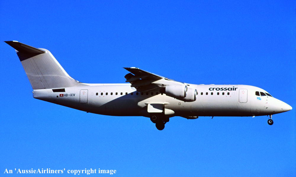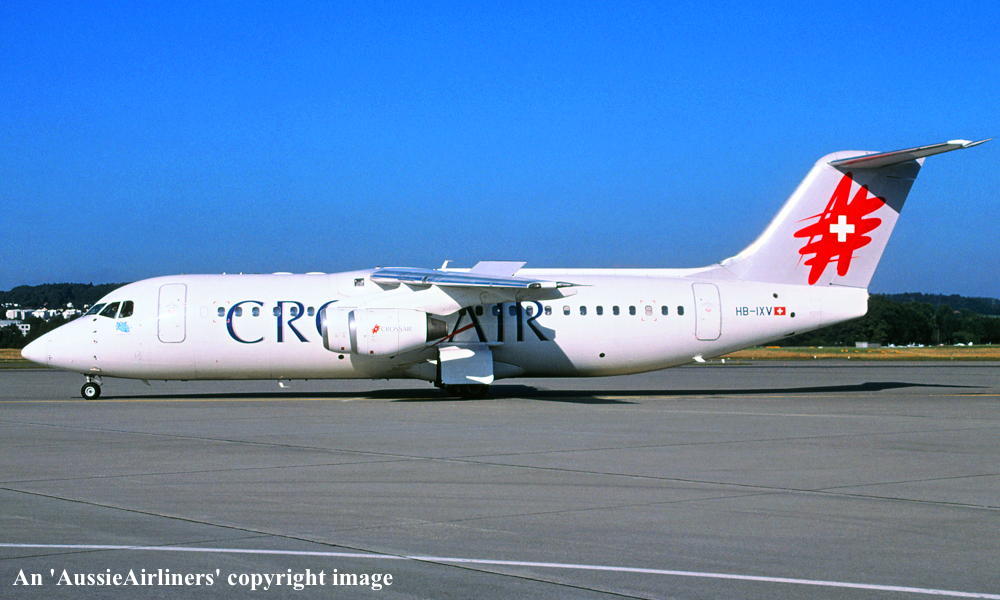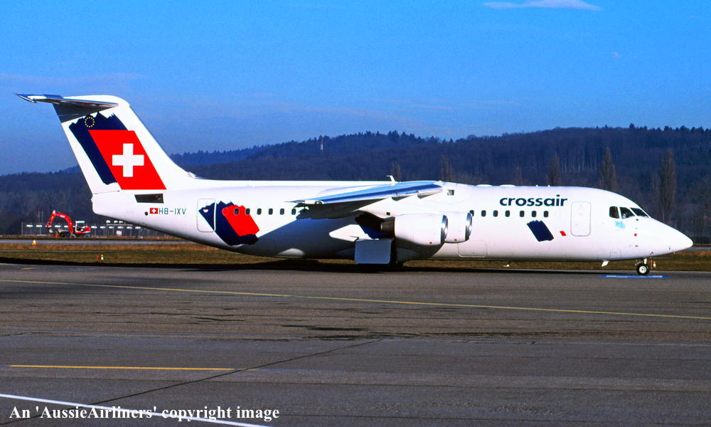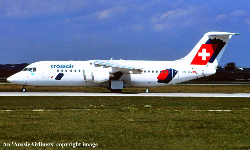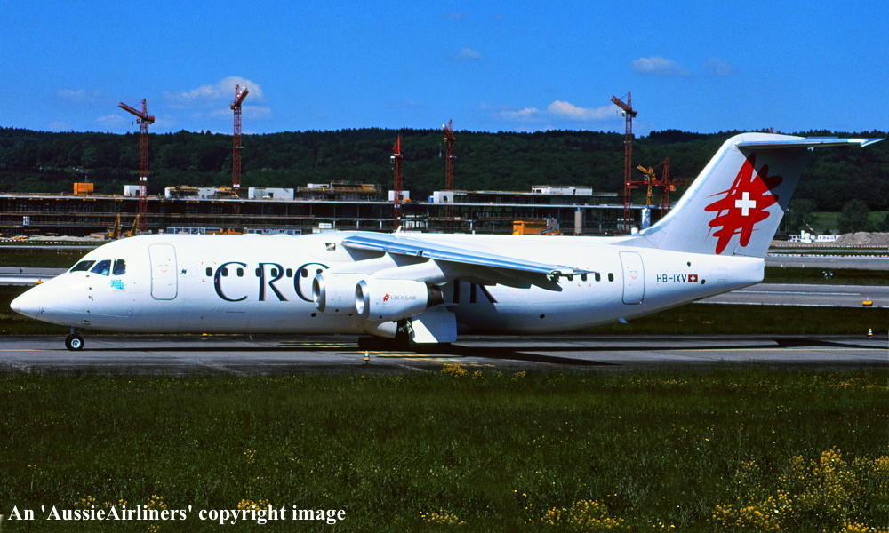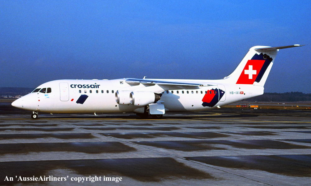HB-IXV. Crossair - in the modified livery at an unknown airport, date unknown. (R. N. Smith Collection Copyright Image 0414-760.) |