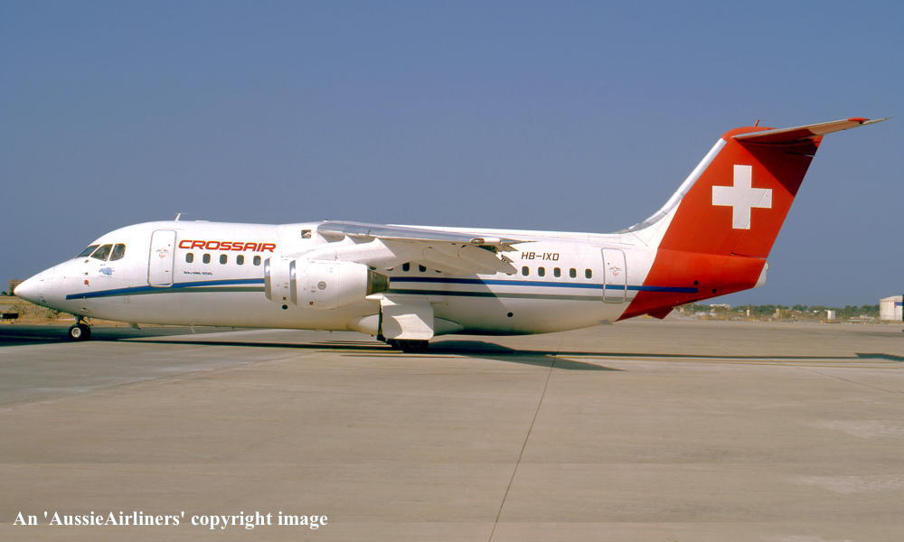 HB-IXD. Crossair - in the standard livery at Palma Airport, August 1993. (R. N. Smith Collection Copyright Image 0414-191.) |