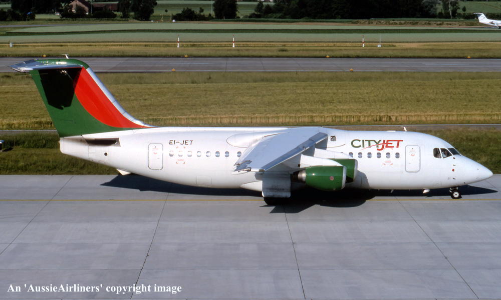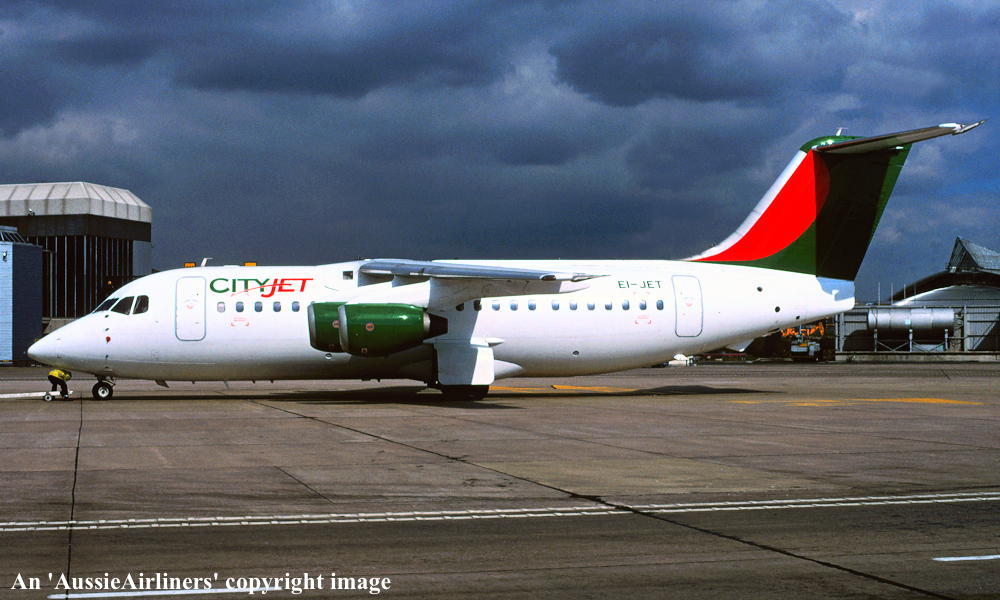 EI-JET. CityJet - in the revised livery at an unknown airport, June 1996. (R. N. Smith Collection Copyright Image 0414-192.) |