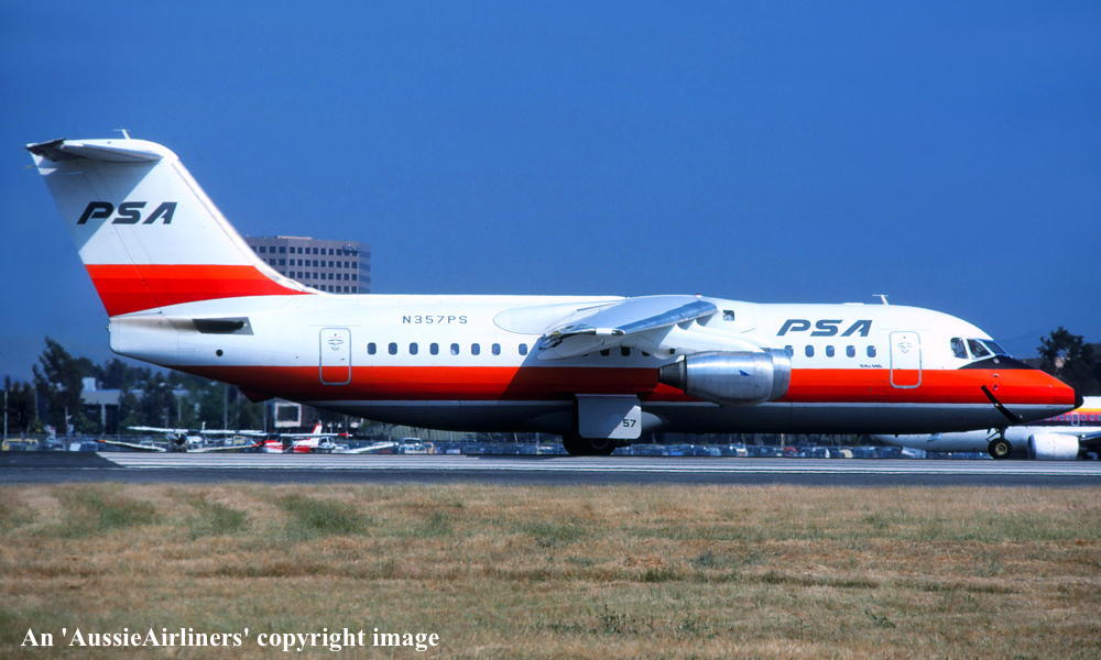 N357PS. PSA - in the standard livery at an unknown airport, May 1986. (P. van Zande Copyright Image 0414-656.) |