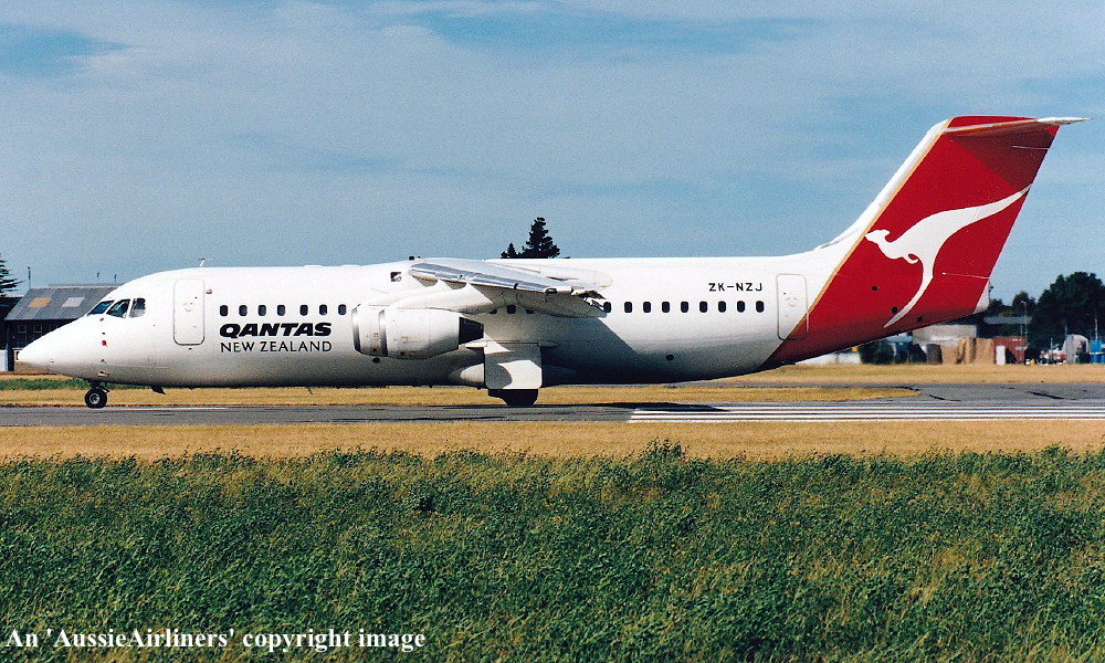 ZK-NZJ. Qantas New Zealand - in the standard livery at Christchurch Airport, November 2001. (J. Mounce Collection Copyright Image 0414-436.) |
