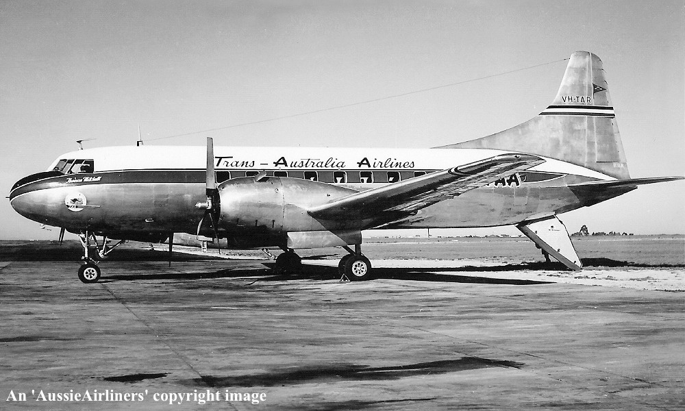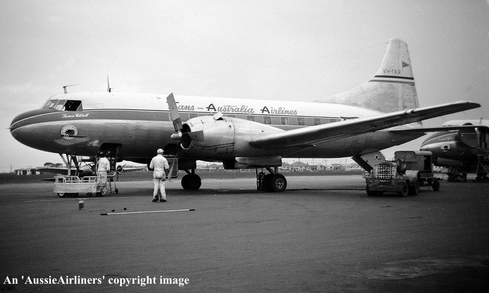 VH-TAR. TAA Trans-Australia Airlines - 'Thomas Mitchell' in the revised livery at Melbourne Essendon Airport, date unknown. (B. Colledge Copyright Image 1029-076.) |
