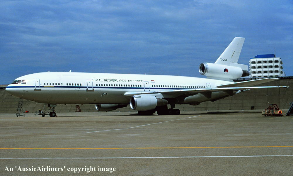 This aircraft was constructed as a cargo convertible freighter / passenger configuration Rolled off the Douglas production line at Long Beach, California - 1978 First flown - October 13, 1978 Powered by General Electric CF6-50C2 engines Entered onto the Dutch Aircraft Register as PH-MBT - December 20, 1978 Registered to Martinair Holland N.V., Schiphol Centre, Amsterdam Accepted by Martinair at Long Beach - December 20, 1978 Departed Long Beach on the delivery flight to the Netherlands - December 20, 1978 Arrived Amsterdam on completion of the delivery flight - December 21, 1978 Operated its first revenue service - December 24, 1978 Leased to Garuda Indonesian Airways in the Martinair livery - October 01, 1979 Returned to Martinair Holland on termination of the lease - Novemer 1979 Leased to Garuda Indonesian Airways in the Martinair livery - September 1981 Returned to Martinair Holland on termination of the lease - October 1981 Wet-leased to Qantas Airways in the Martinair livery - December 21, 1987 Small 'On Lease To Qantas' decals were placed above the forward entrance doors This aircraft was chartered to cover for a capacity shortfall during the 1987 Christmas holiday period Operated its first Qantas revenue service Sydney - Brisbane - Singapore as QF843 - December 24, 1987 Operated its final Qantas revenue service Singapore - Brisbane - Sydney as QF842 - February 11, 1988 Returned to Martinair on termination of the lease - February 16, 1988 Sold to United Aviation Services - January 05, 1989 Registered to Global Leasing SpA, Curacao Leased to Martinair Holland as the registered operator Sub-leasded to KLM Royal Dutch Airlines - October 17, 1989 The aircraft was repainted into the standard K.L.M. livery The aircraft was named 'George Gershwin' Returned to Martinair Holland on termination of the lease - April 30, 1992 Sold to the Royal Netherlands Air Force - June 01, 1992 Leased to Martinair Holland as the registered operator Sub-leased to World Airways - June 24, 1992 Ferried Amsterdam (Schiphol) - Frankfurt - Dhahran in the Martinair livery - June 25, 1992 Returned to Martinair on termination of the lease - July 08, 1992 Registered to State of the Netherlands, The Hague - February 04, 1993 Leased to Martinair Holland as the registered operator Operated the final Martinair revenue service - September 12, 1994 Withdrawn from service at Amsterdam (Schiphol) - September 12, 1994 Returned to the Royal Netherlands Air Force - October 06, 1994 Cancelled from the Dutch Aircraft Register - October 06, 1994 It was observed at Amsterdam (Schiphol) as Royal Netherlands Air Force aircraft 'T-264' - June 30, 1995 It was observed at Amsterdam (Schiphol) in the standard Royal Nerherlands Air Force livery - September 1995 The aircraft had been converted to multi-role tanker/transport (Douglas KDC-10) This conversion included the installation of an extendable refuelling boom and external lights, a 'RARO' - 'Remote Air Refuelling Operating' station and a new 'glass cockpit' The aircraft was assigned to No. 334 Squadron, Eindhoven Air Force Base, Netherlands It was observed at Eindhoven Air Force Base in the old 'white' livery - April 18, 2004 It was observed at Eindhoven Air Force Base in the low-visibility grey livery Current with the Royal Netherlands Air Force |
