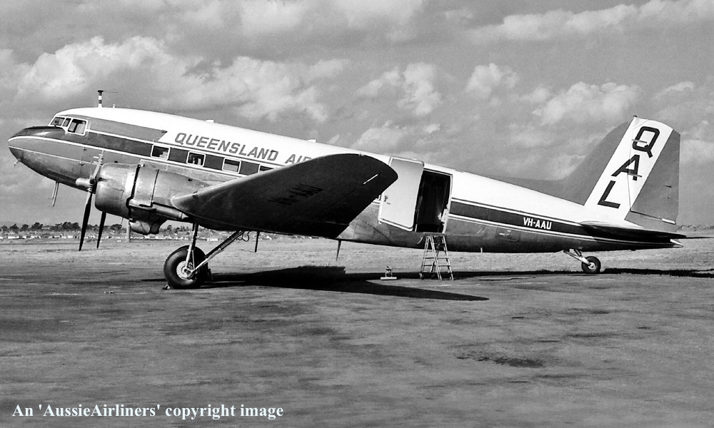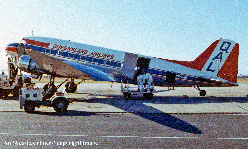 VH-AAU. Q.A.L. Queensland Airlines - in the final livery at Brisbane Eagle Farm Airport, date unknown. (R. N. Smith Collection Copyright Image 0251-717.) |