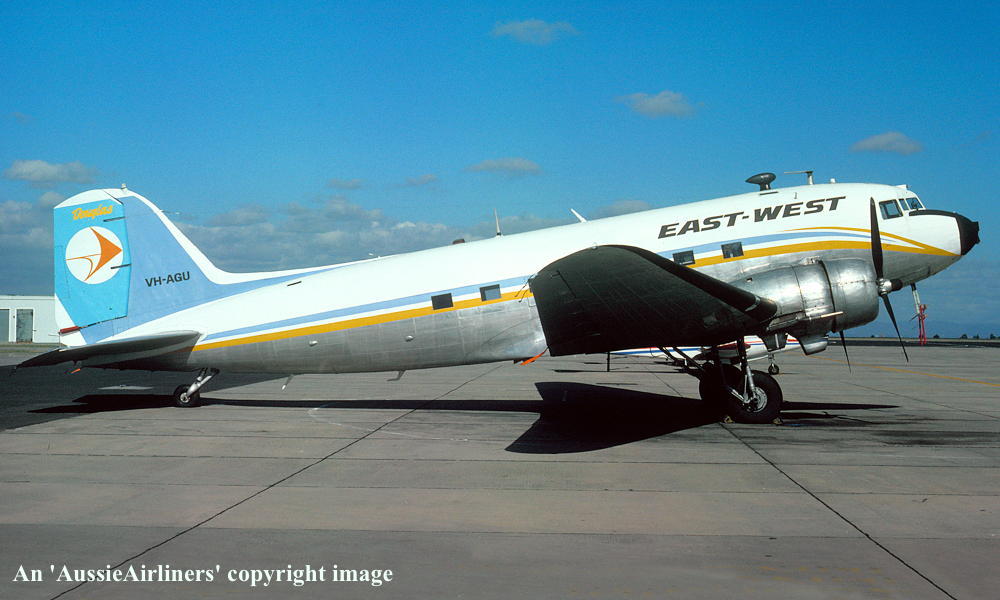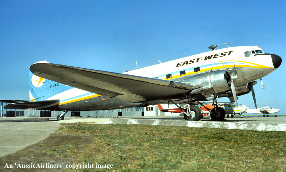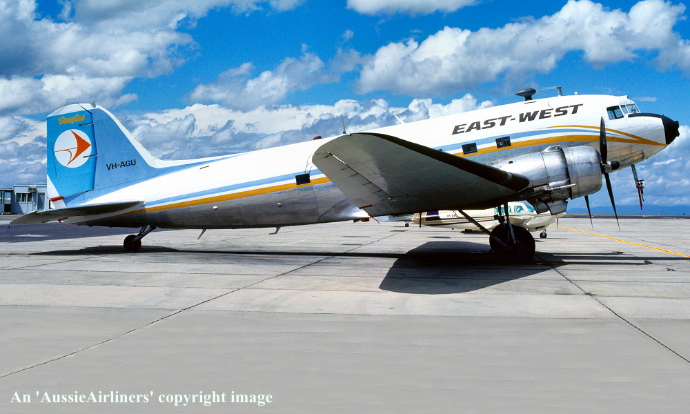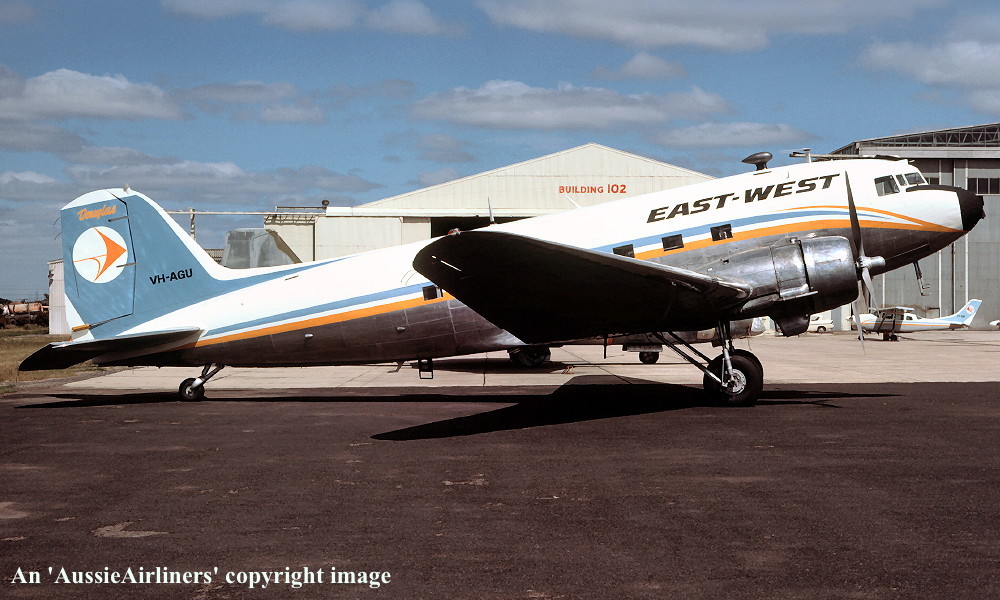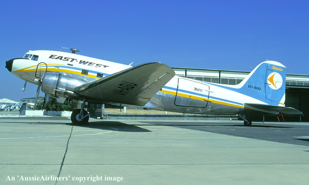 VH-AGU. Great Pacific Aeroplane Company - in the basic 'East-West' livery at Melbourne Essendon Airport, date unknown. (R. N. Smith Collection Copyright Image 0250-015.) |