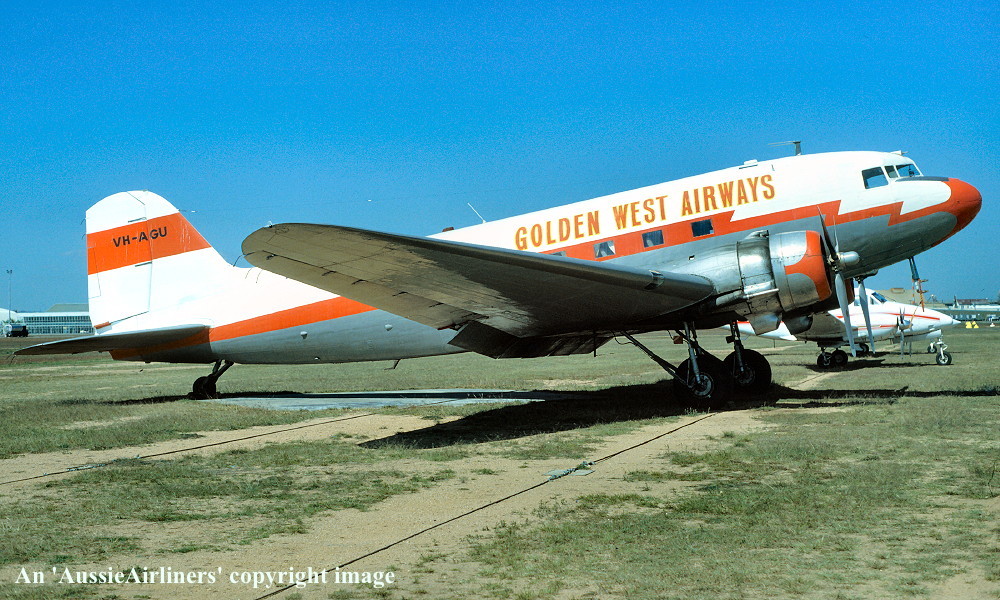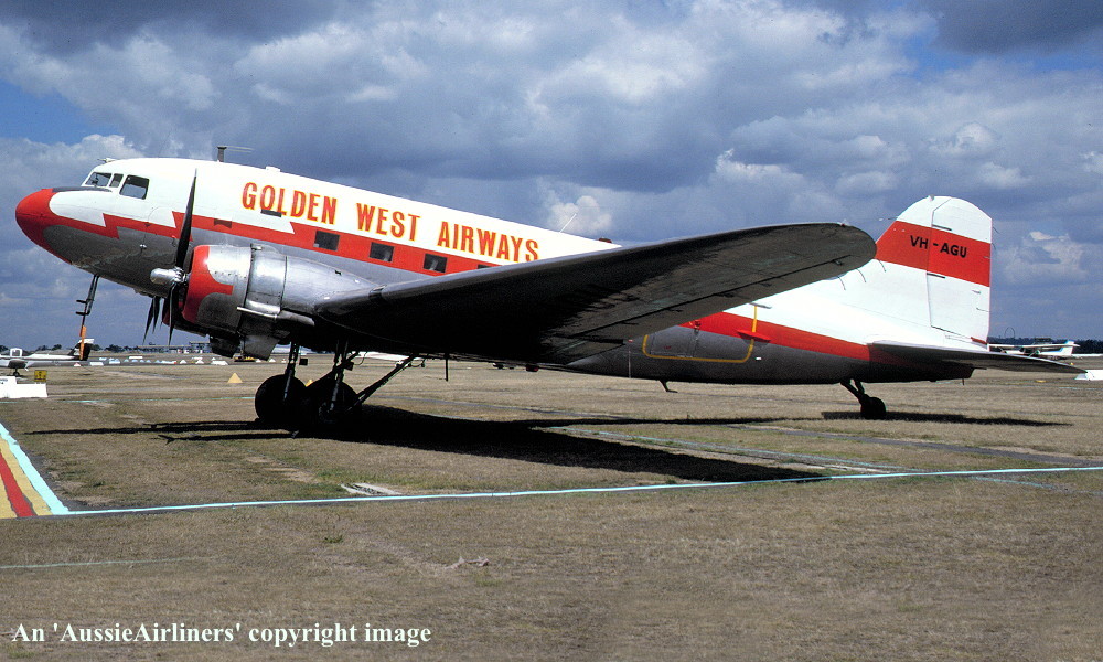 VH-AGU. Dakota Airways - in the 'Golden West Airways' livery at Brisbane Archerfield Airport, June 25, 1988. (R. N. Smith Collection Copyright Image 0251-019.) |