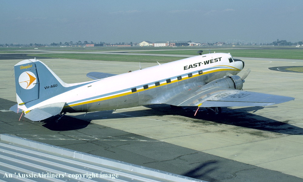 VH-AGU. East-West - in the standard livery at Melbourne Essendon Airport, August 1975. (R. N. Smith Collection Copyright Image 0250-241.) |