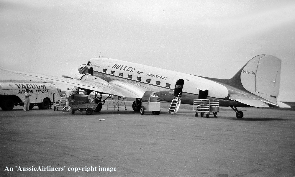 VH-AOH. Butler Air Transport Pty Ltd - 'RMA Warrumbungle' in the standard livery at Melbourne Essendon irport, date unknown. (B. Colledge Copyright Image 0250-700.) |