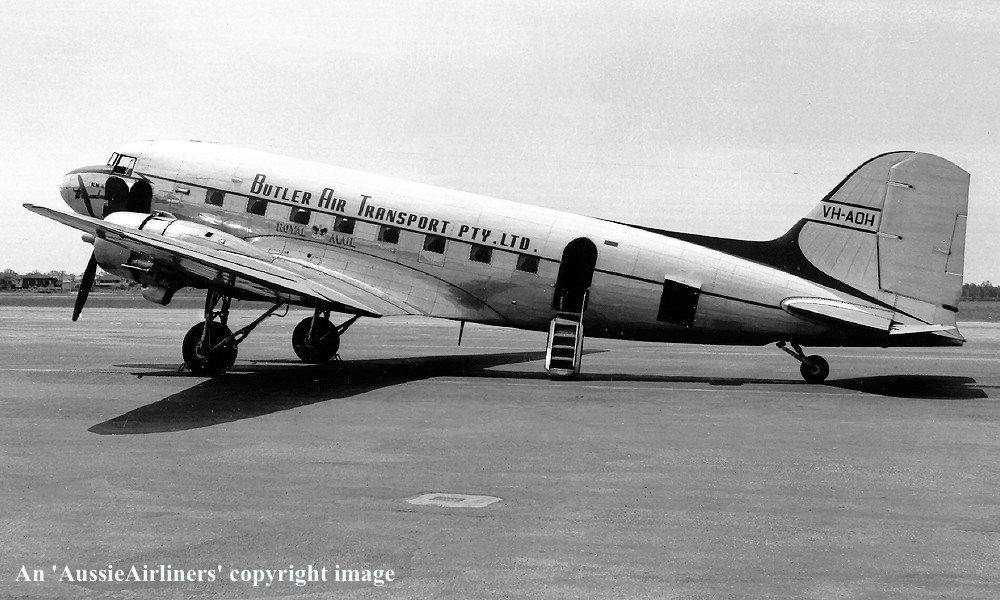 VH-AOH. Butler Air Transport Pty Ltd - 'RMA Warrumbungle' in the standard livery at an unknown airport, date unknown. (R. N. Smith Collection Copyright Image 0250-757.) |