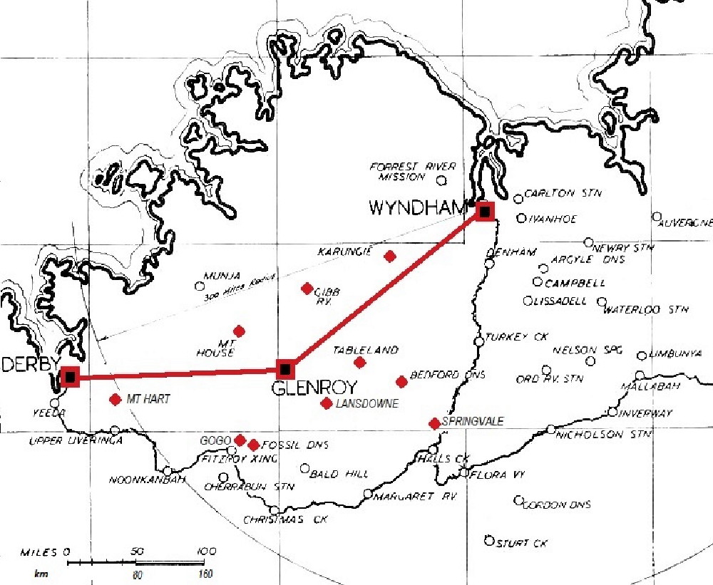 On 13 May, 1949, the Air Beef Scheme began operations, with MMA DC-3 VH-MMF operating Glenroy - Wyndham. Cattle were slaughtered and chilled at Glenroy, starting 11 May. Glenroy was used as the base for surrounding stations, such as Bedford Downs, Fossil Downs, Gibb River, GoGo, Mt. Hart, Mt. House, Karunjie, Lansdowne, Springvale and Tableland. Initially some 3 round-trips were operated per day from Glenroy Station, near Mt. House, by air to Wyndham (297km north-east), plus a few trips to Derby (254km south-west) from 1955, using the non-refrigerated aircraft. They operated for a period of some 4.5 months per year during the Dry Season, usually from May to August. At Wyndham the beef carcusses were quartered, frozen and wrapped at the Government abattoir, mainly for shipment to the United Kingdom (the early operations to Derby were mainly for transhipment within W.A.). MMA stationed 3 pilots at Glenroy for the season (Captains Cyril Kleinig, Sturdee Jordan and Bill Pepper) while A.N.A. provided Captain John Bunstead as co-pilot and photographer.