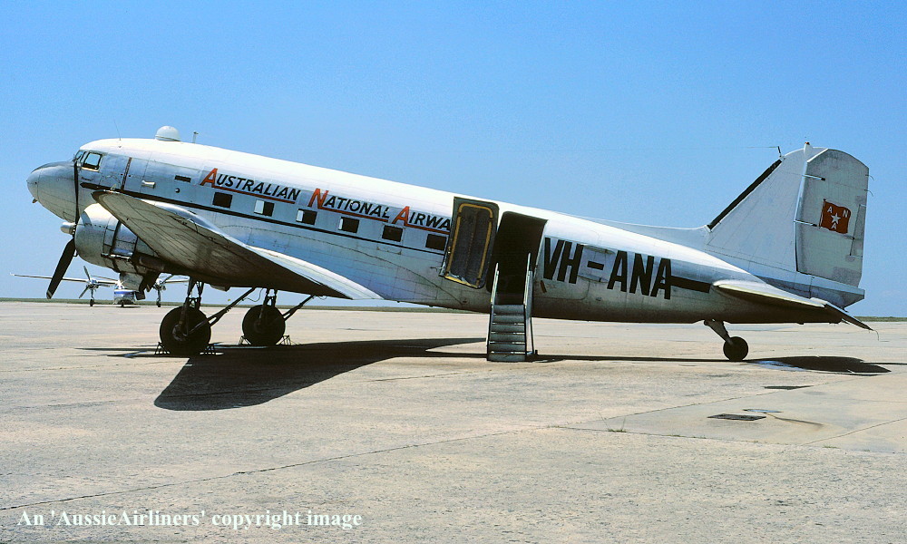A65-102. Australian National Airways - in the basic R.A.A.F. livery painted up as 'VH-ANA' for a movie at Camden Airport, June 21, 1987. (E. D. Daw Copyright Image 0251-043.) |