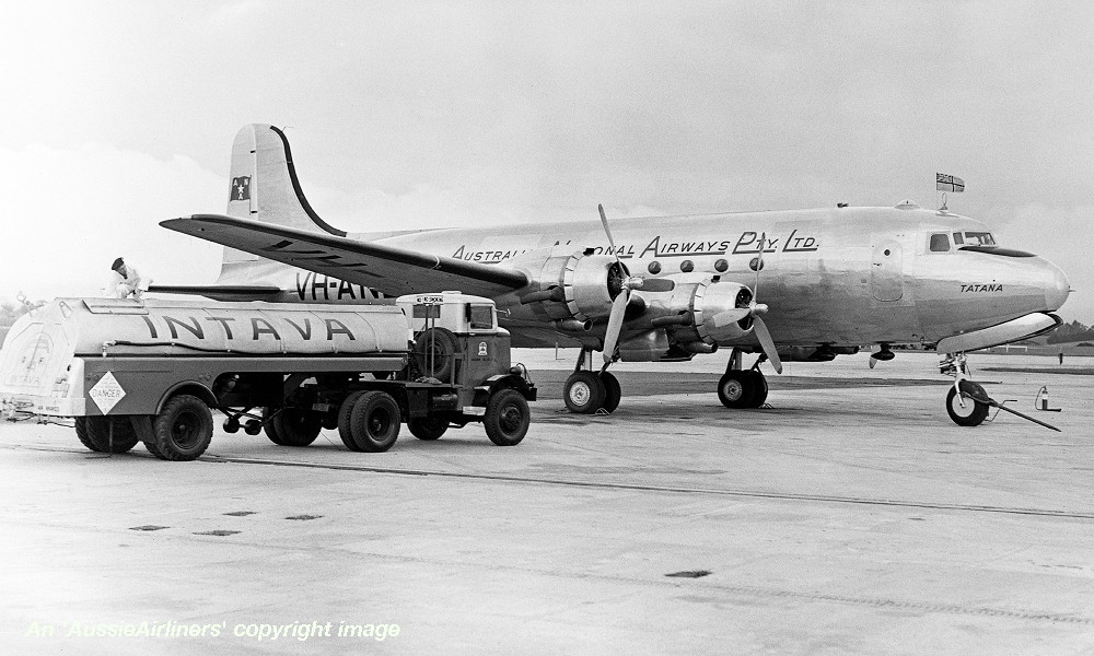 VH-AND. Australian National Airways Pty Ltd - 'Tatana' in the revised livery at Melbourne Essendon Airport, date unknown. (Civil Aviation Historical Society Copyright Image 1125-740.) |