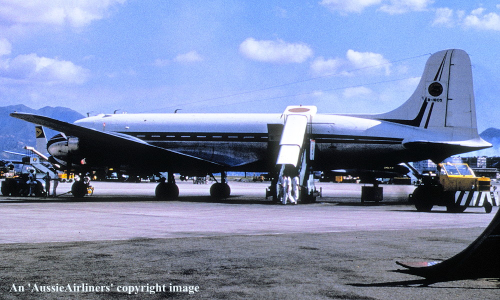 B-1805. Vietnam Airlines - in the basic China Airlines livery at Hong Kong Kai Tak Airport, February 1970. (R. N. Smith Collection Copyright Image 1125-120.) |
