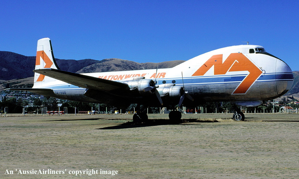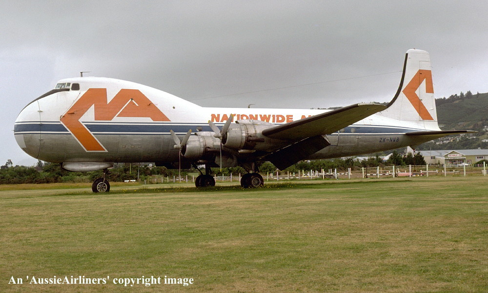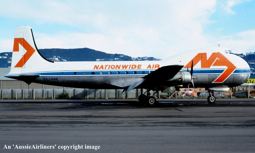ZK-NWB. Nationwide Air - in the standard livery at Wellington Airport, July 1979. (R. N. Smith Collection Copyright Image 1125-659.) |