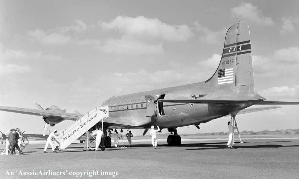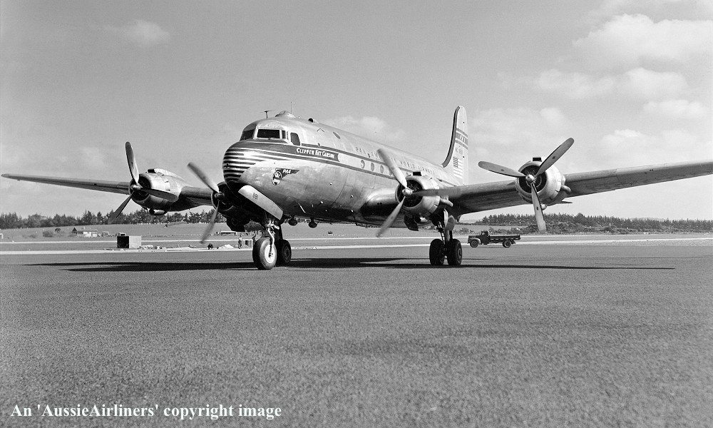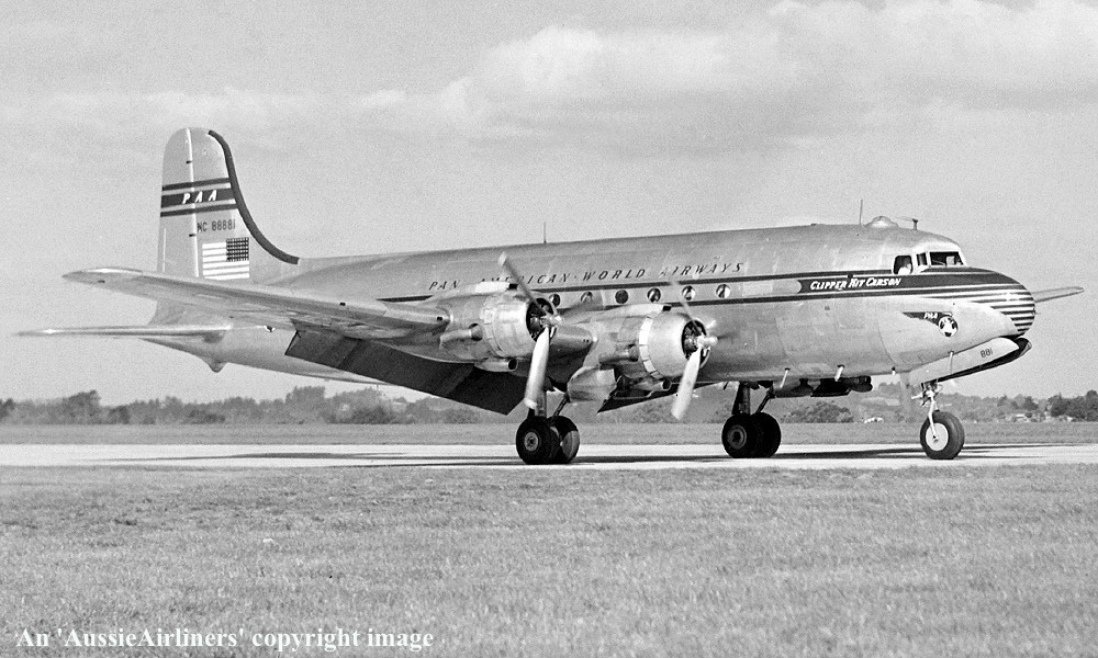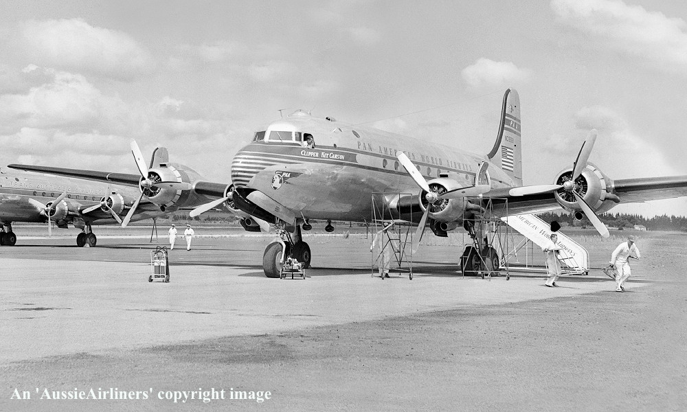 NC88881. Pan American World Airways - 'Clipper Kit Carson' in the standard livery at Auckland Whenuapai Airport, March 19, 1948. (Whites Aviation WA-12629-F Copyright Image 1125-657.) |
