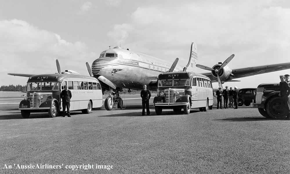 NC88881. Pan American World Airways - 'Clipper Kit Carson' in the standard livery at Auckland Whenuapai Airport, October 10, 1946. (Whites Aviation WA-04015-F Copyright Image 1125-656.) |