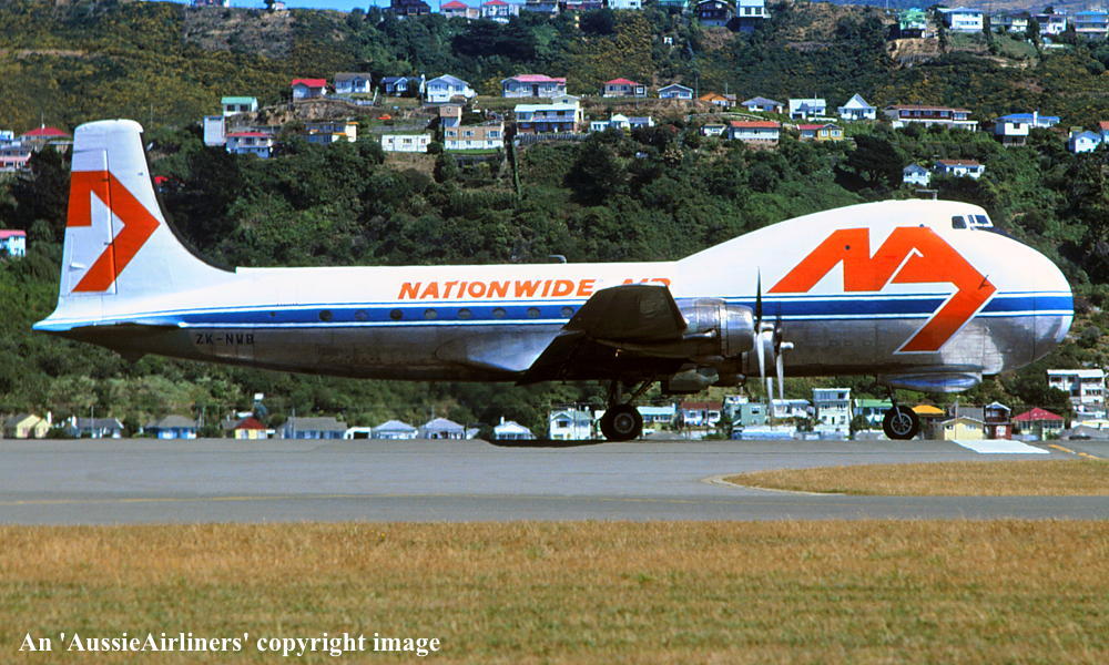 ZK-NWB. Nationwide Air - in the standard livery at Wellington Airport, February 26, 1979. (R. N. Smith Collection Copyright Image 1125-737.) |