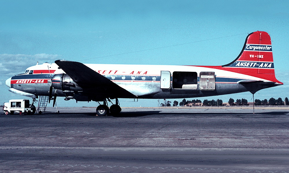 VH-INX. Ansett-ANA Cargomaster - in the standard livery at Melbourne Essendon Airport, date unknown.