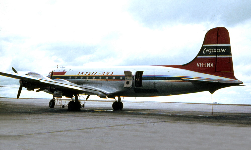 VH-INX. Ansett-ANA Cargomaster - in the original livery at Melbourne Essendon Airport, date unknown.