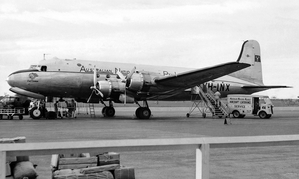 VH-INX. Australian National Airways Pty Ltd - 'Kattana' in the revised livery at Brisbane Airport, circa 1956.