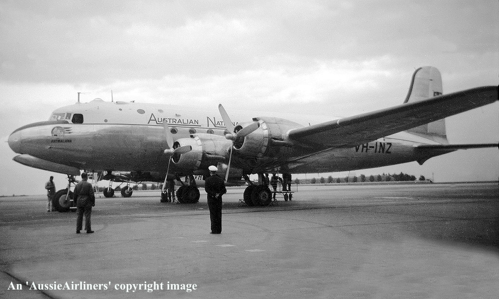 VH-INZ. Australian National Airways Pty Ltd - 'Ratmalana' in the revised livery at Melbourne Essendon Airport, date unknown. (B. Colledge Copyright Image 1125-441.) |