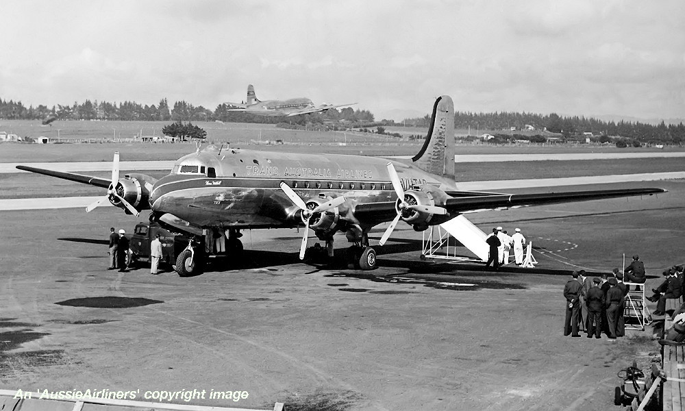 VH-TAB. Trans-Australia Airlines - 'Thomas Mitchell' in the original livery at Whenuapai Airport, February 1947. (Whites Aviation Copyright Image 1125-511.) |