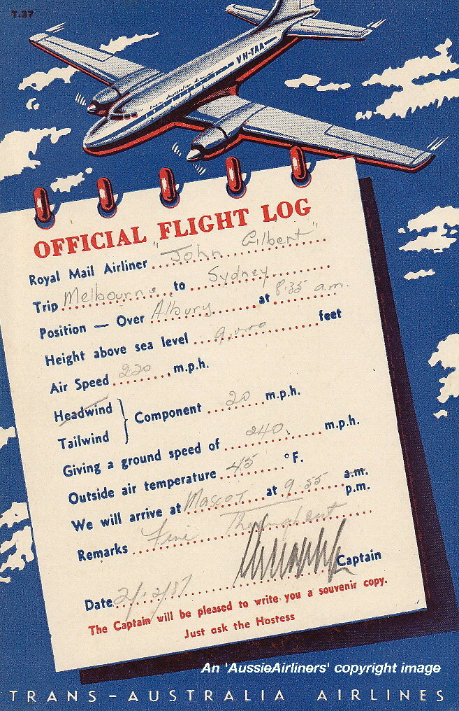 VH-TAB. TAA Trans-Australia Airlines - 'John Gillbert' - Official Flight Log, December 02, 1957. (A. von Sterakowski Collection Copyright Image 1125-646.) |