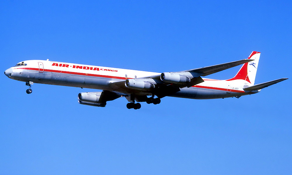LX-ACV. Air India Cargo - in the standard livery at an unknown airport, September 1980.