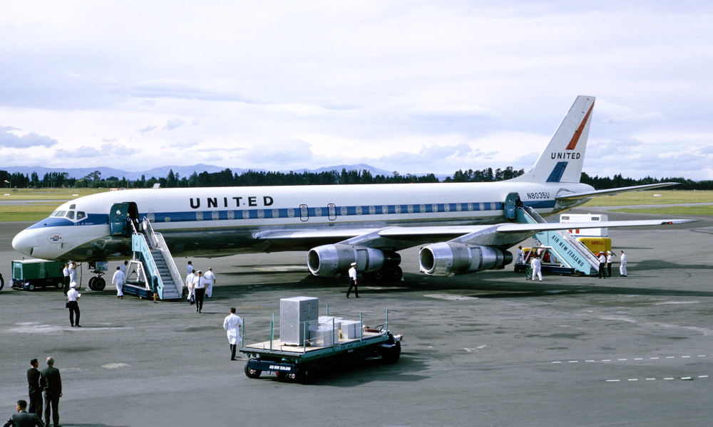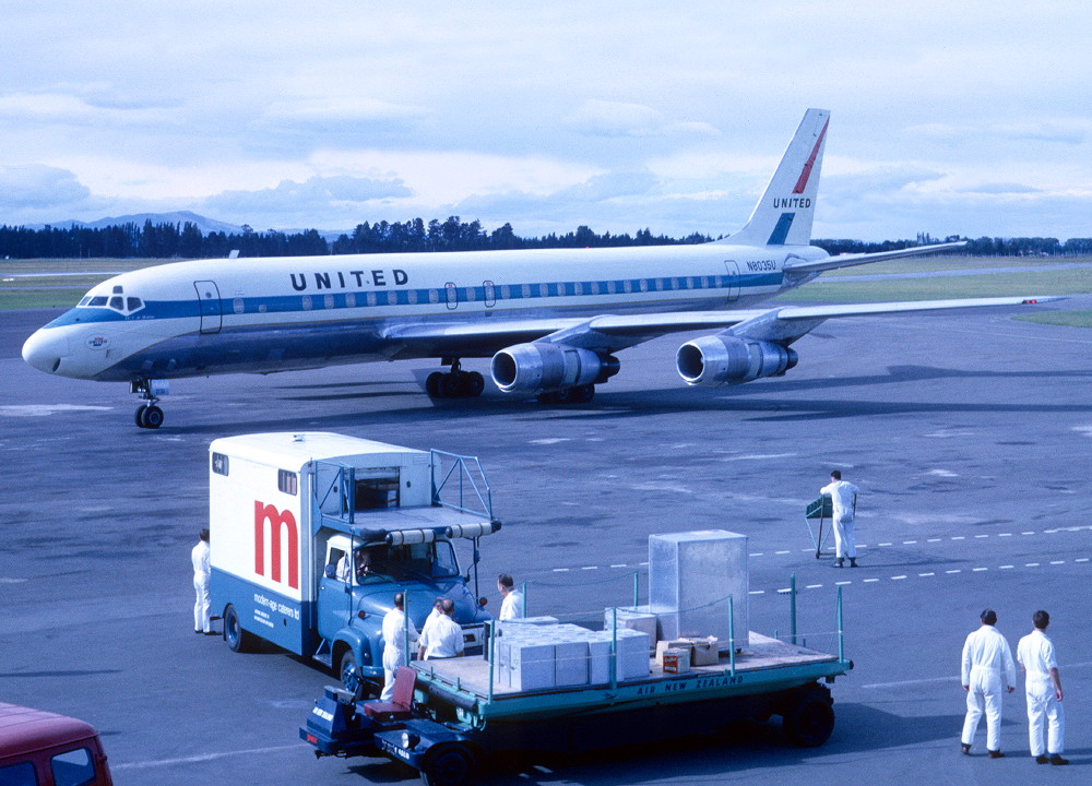 N8035U. United - in the old livery at Christchurch Airport, November 1967. (S. Pinnow Collection Copyright Image 1130-114.)