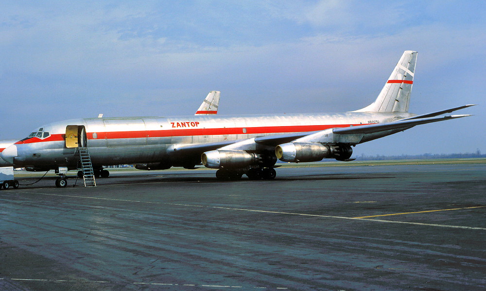 N8209U. Zantop - in the metal livery at an unknown airport, April 1982.