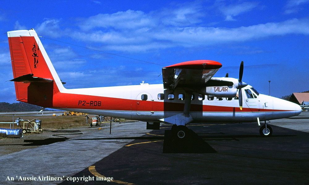 P2-RDB. Talair - in the standard livery at an unknown airport, August 1987. (R. N. Smith Collection Copyright Image 1920-904.) |