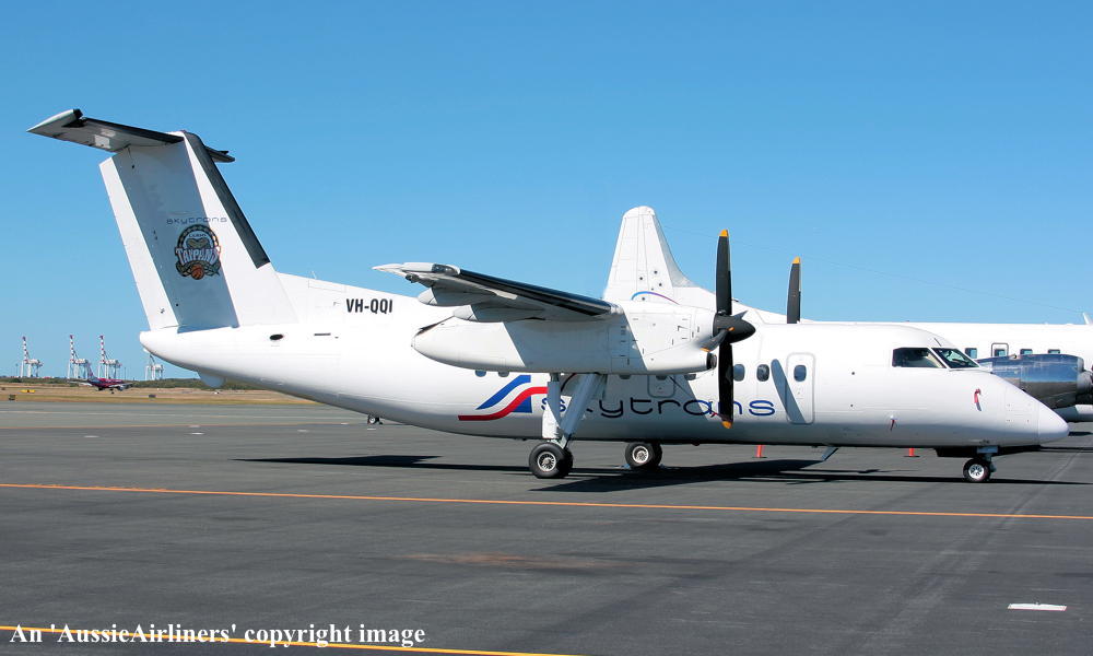 VH-QQI. Skytrans - in the standard livery with additional 'Cairns Tiapans' basketball team logo at Brisbane Airport, August 2008. (R. N. Smith Collection Copyright Image 2923-376.) |