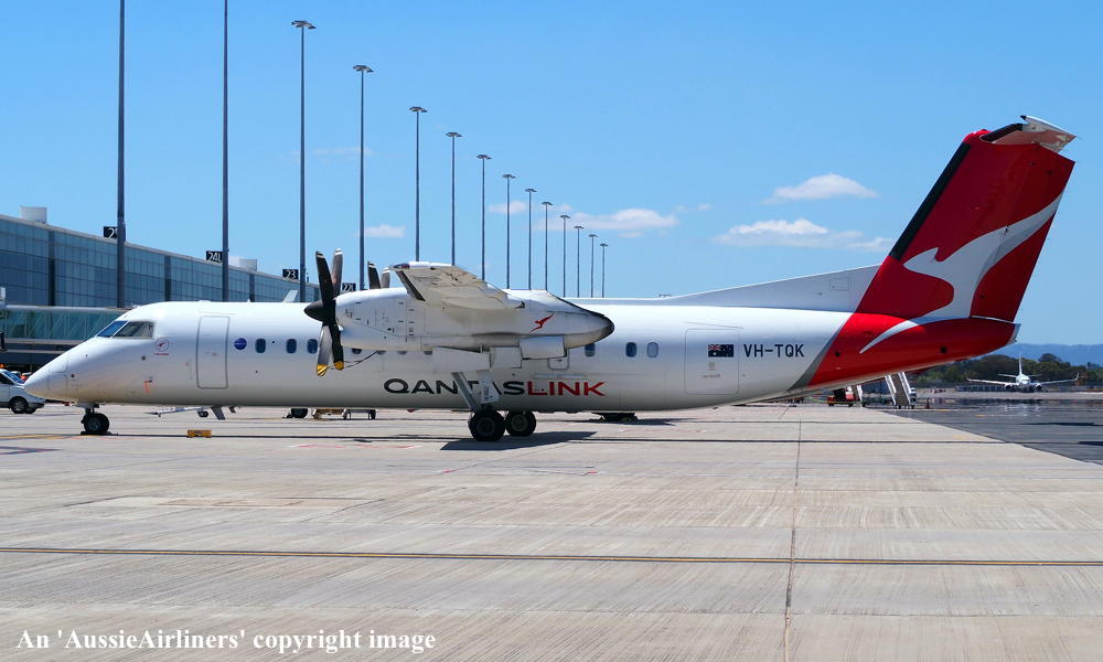 VH-TQK. QantasLink - 'Tathra' in the 'silver roo' livery at Adelaide West Beach Airport, December 27, 2021. (T. Haynes Copyright Image 2924-129.) |