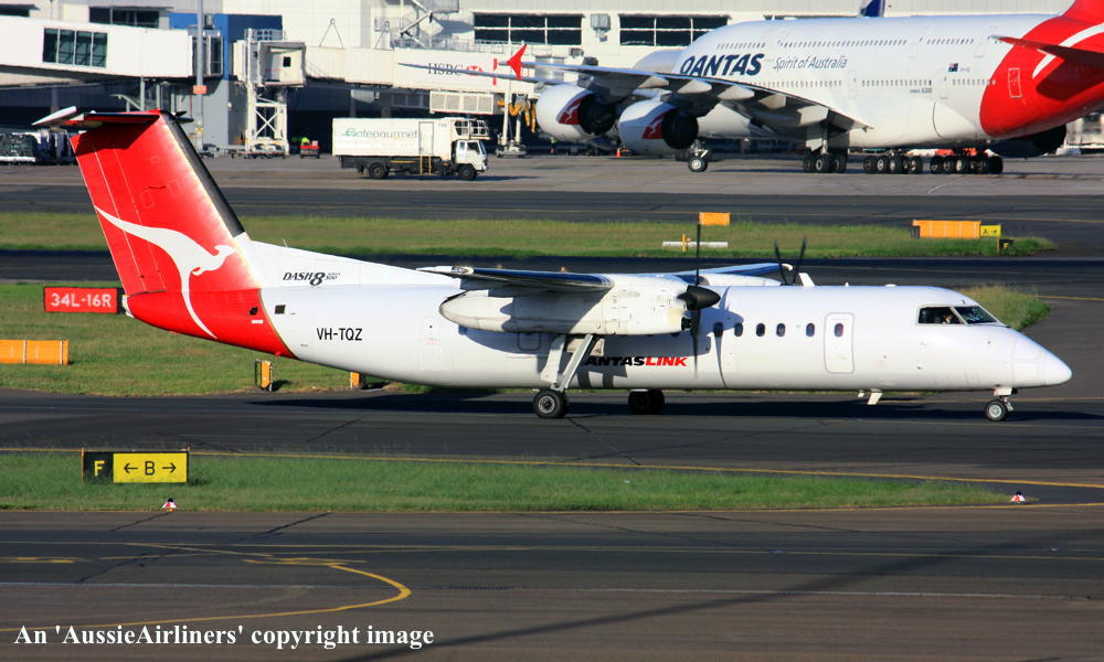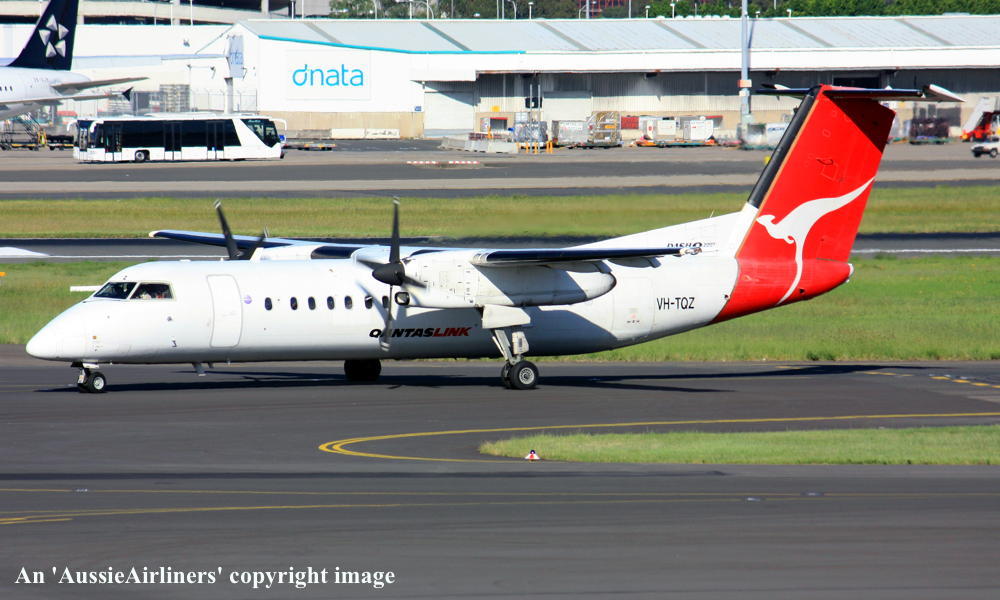 VH-TQZ. QantasLink - in the original livery at Sydney Kingsford Smith Airport, March 10, 2014. (T. Haynes Copyright Image 2923-217.) |
