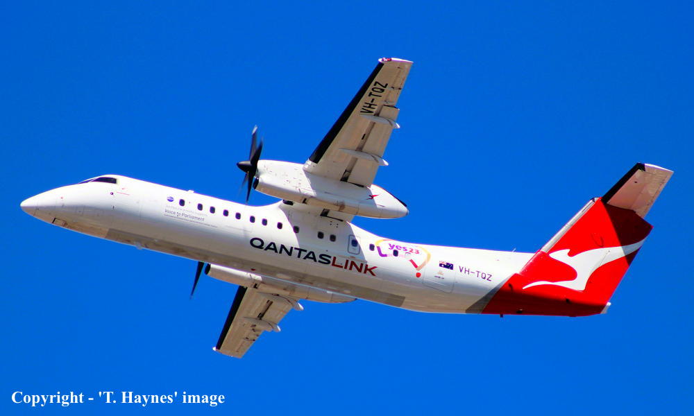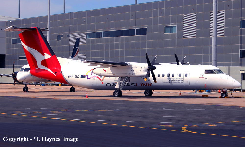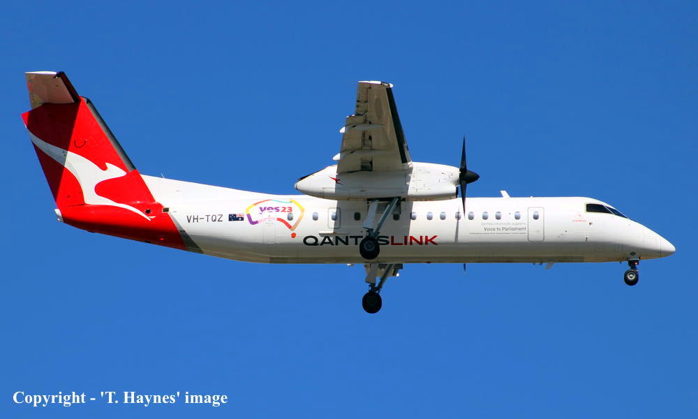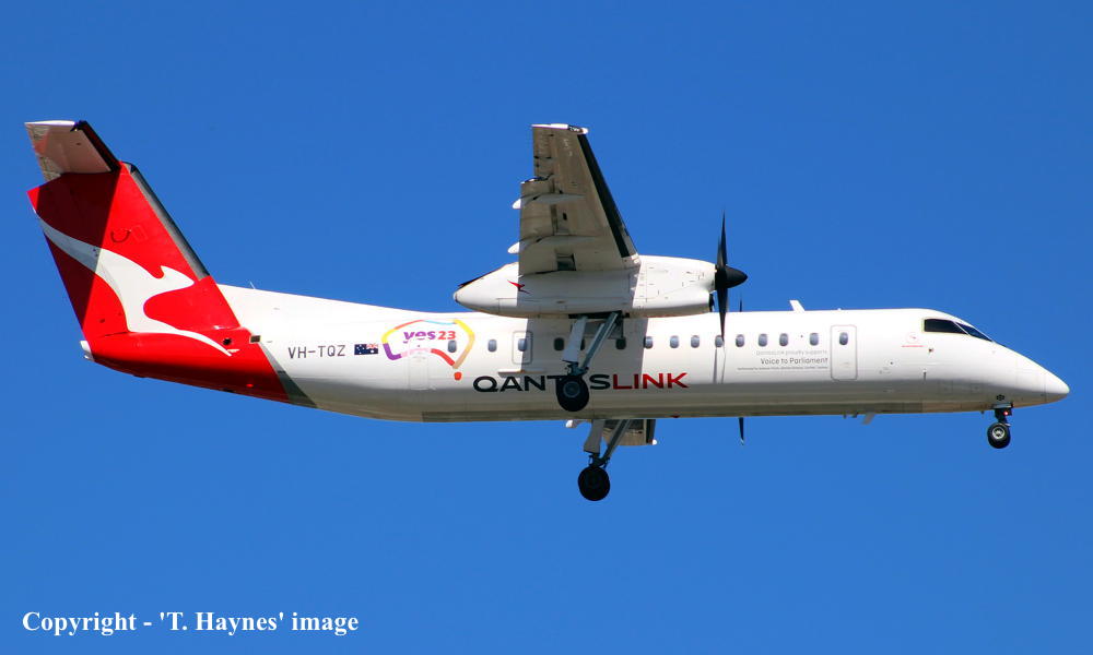 VH-TQZ. QantasLink - 'Bundaberg' in the 'Silver Roo' livery with additional 'Yes 23' decals at Adelaide West Beach Airport, October 01, 2023. (T. Haynes Copyright Image 2924-220.) |