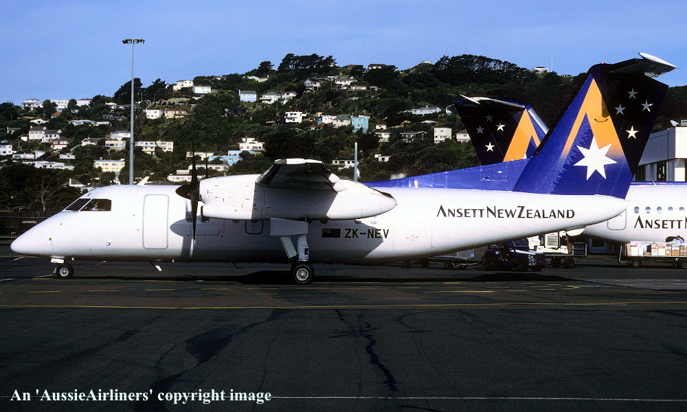 ZK-NEV. Ansett New Zealand - in the 'Starmark' livery at Wellington Airport, December 01, 1995. (M. Richardson Copyright Image 2923-086.) |