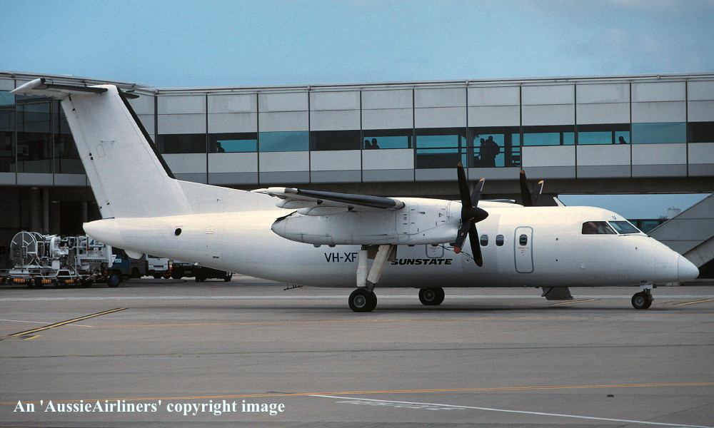 VH-XFU. Sunstate - in the all-white livery at Brisbane Airport, September 1997. (R. N. Smith Collection Copyright Image 2923-089.) |