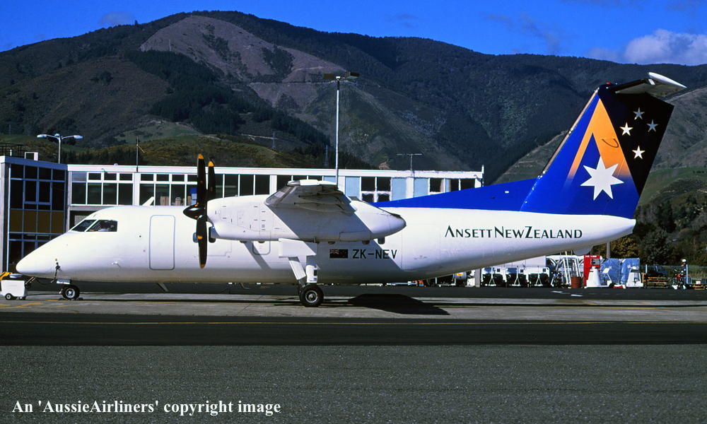 ZK-NEV. Ansett New Zealand - in the 'Starmark' livery at Nelson Airport, August 1995. (M. Richardson Copyright Image 2923-095.) |