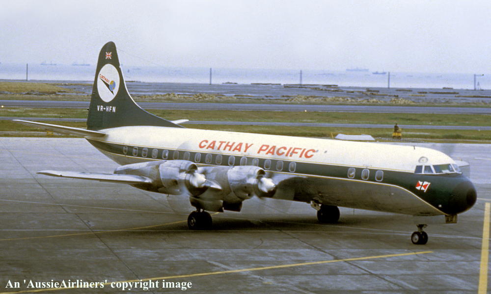 VR-HFN. Cathay Pacific - in the standard livery at Hong Kong Kai Tak Airport, date unknown. (R. N. Smith Collection Copyright Image 1808-397.) |