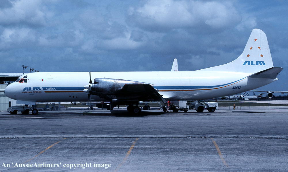 N665F. ALM Antillean Airlines Cargo - in the standard livery at Miami Airport, April 1991. (R. N. Smith Collection Copyright Image 1808-680.) |