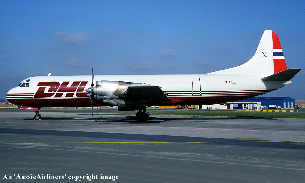 LN-FOL. DHL - in the standard livery at an unknown airport, October 1994. (R. N. Smith Collection Copyright Image 1808-502.) |