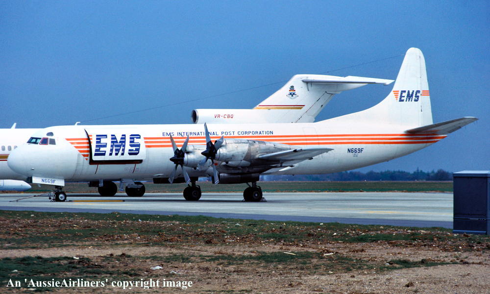 N669F. EMS International Post Corporation - in the standard livery at an unknown airport, June 1990. (R. N. Smith Collection Copyright Image 1808-534.) |