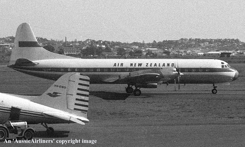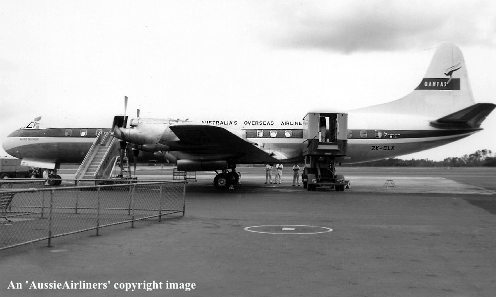 ZK-CLX. Air New Zealand - in the basic Qantas livery at Sydney Kingsford Smith Airport, April 1965. (R. N. Smith Copyright Image 1808-033.) |