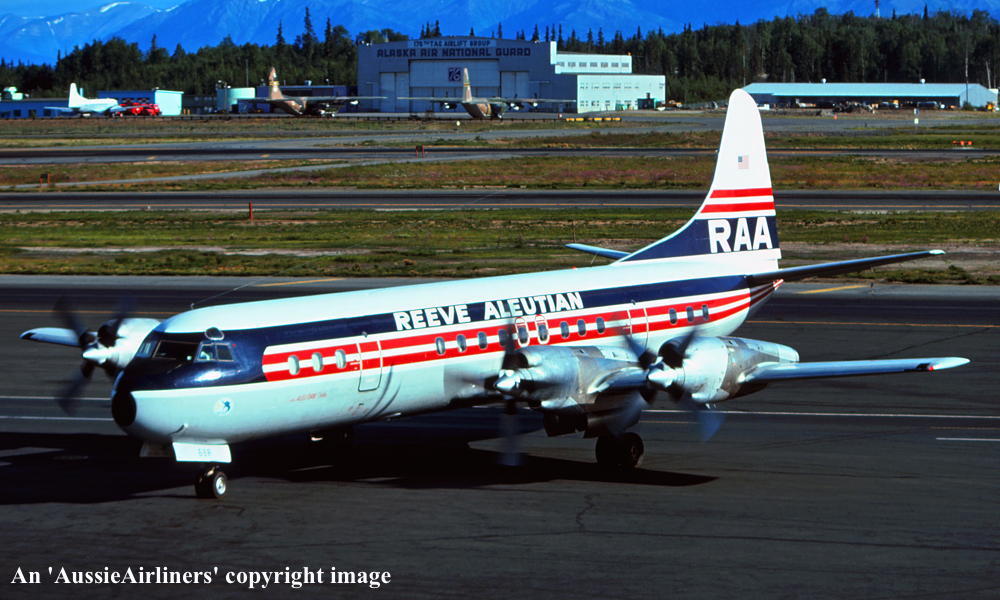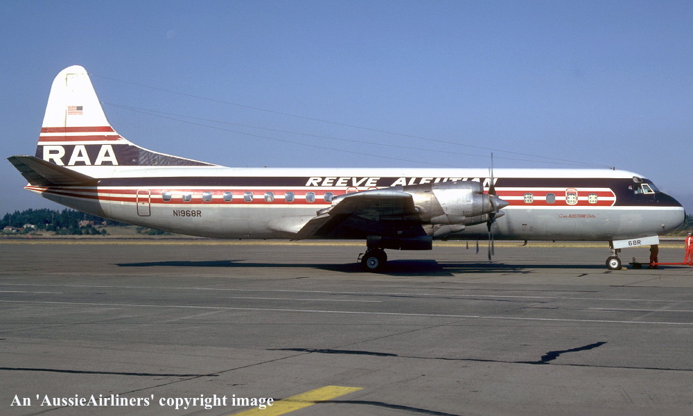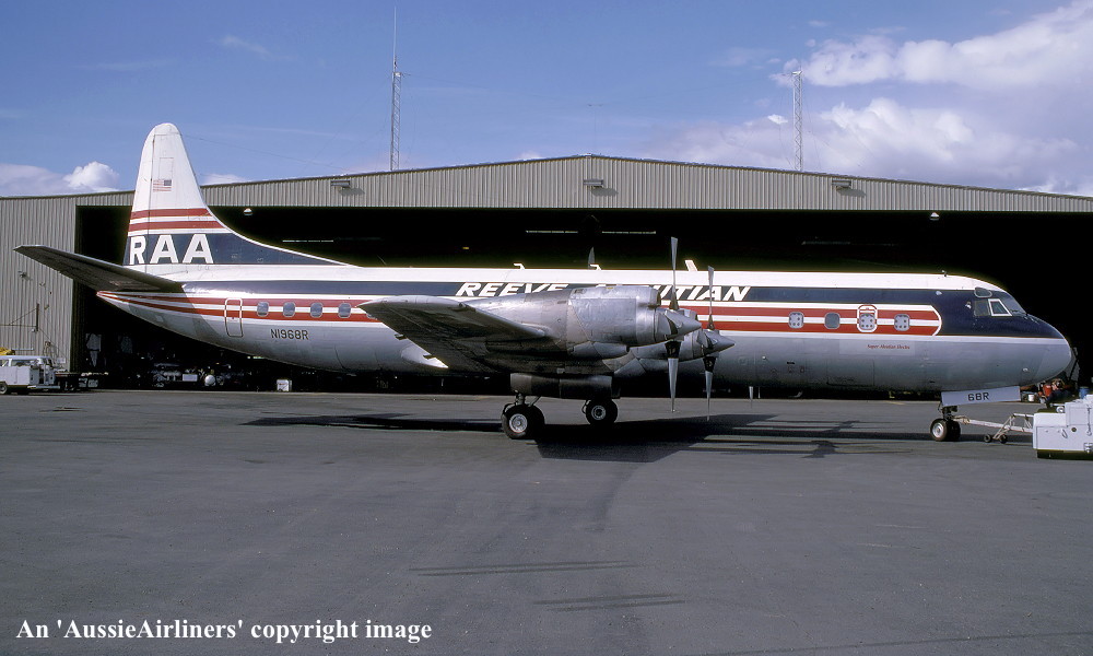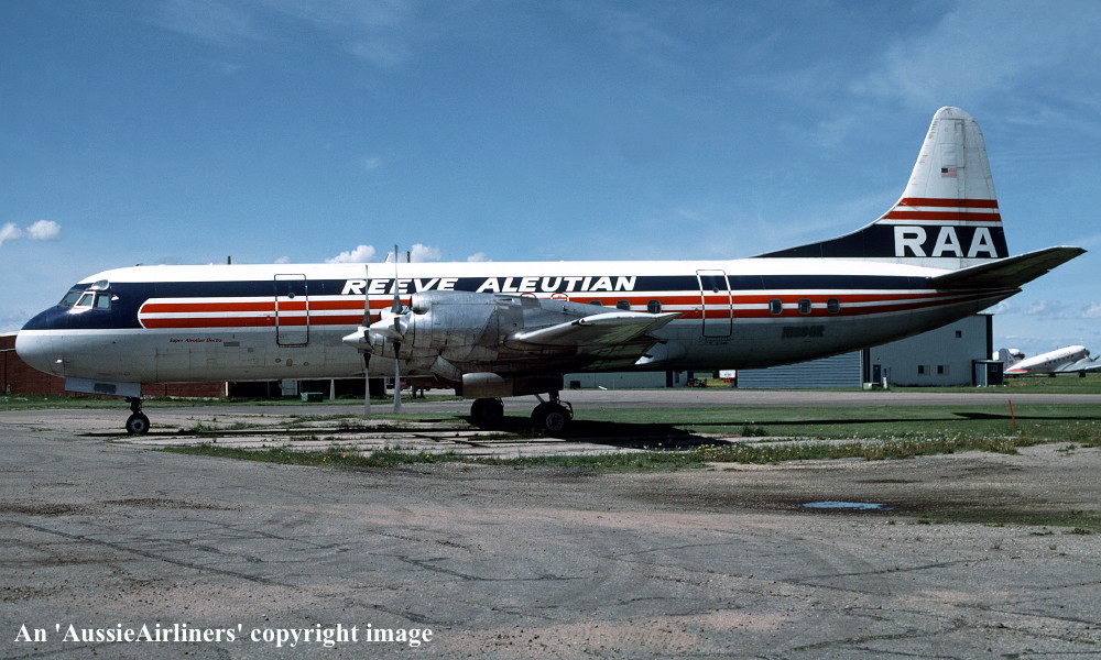 N1968R. Reeve Aleutian - in the standard livery at Anchorage Airport, July 1982. (R. N. Smith Collection Copyright Image 1808-036.) |