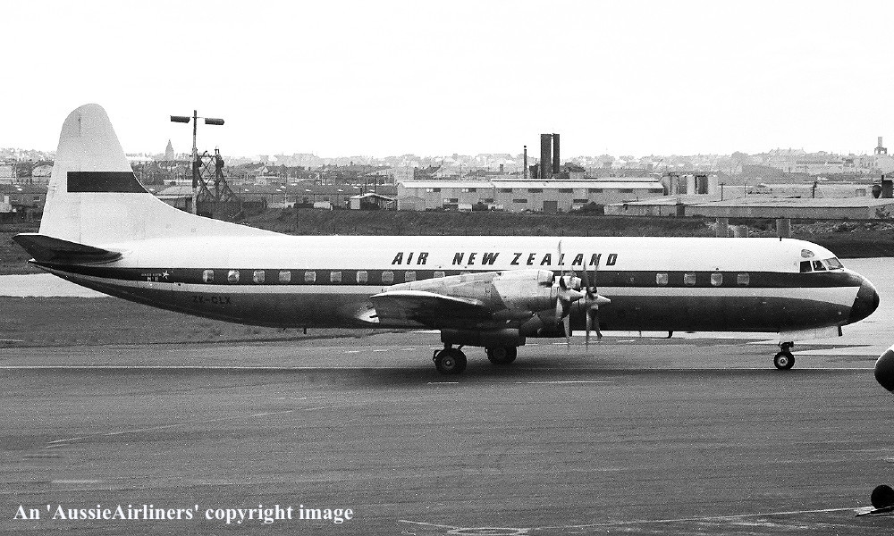 ZK-CLX. TEAL Air New Zealand - 'Akaroa' in the standard livery at Auckland Airport, November 1965. (R. N. Smith Collection Copyright Image 1808-969.) |