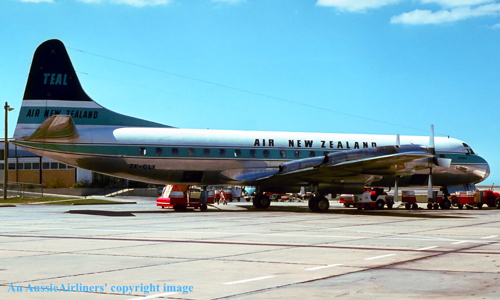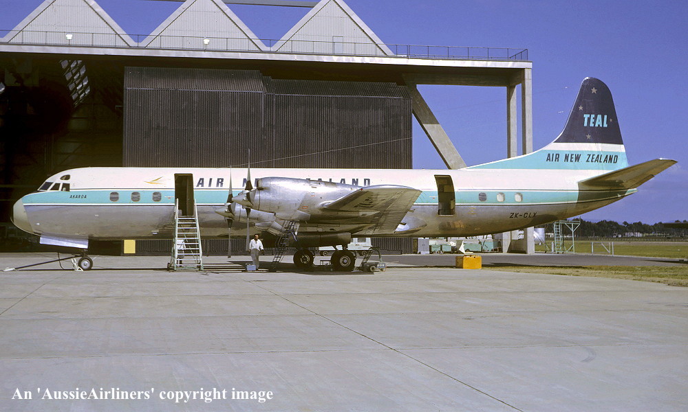 ZK-CLX. TEAL Air New Zealand - 'Akaroa' in the standard livery at Melbourne Essendon Airport, July 1965. (R. N. Smith Collection Copyright Image 1808-548.) |