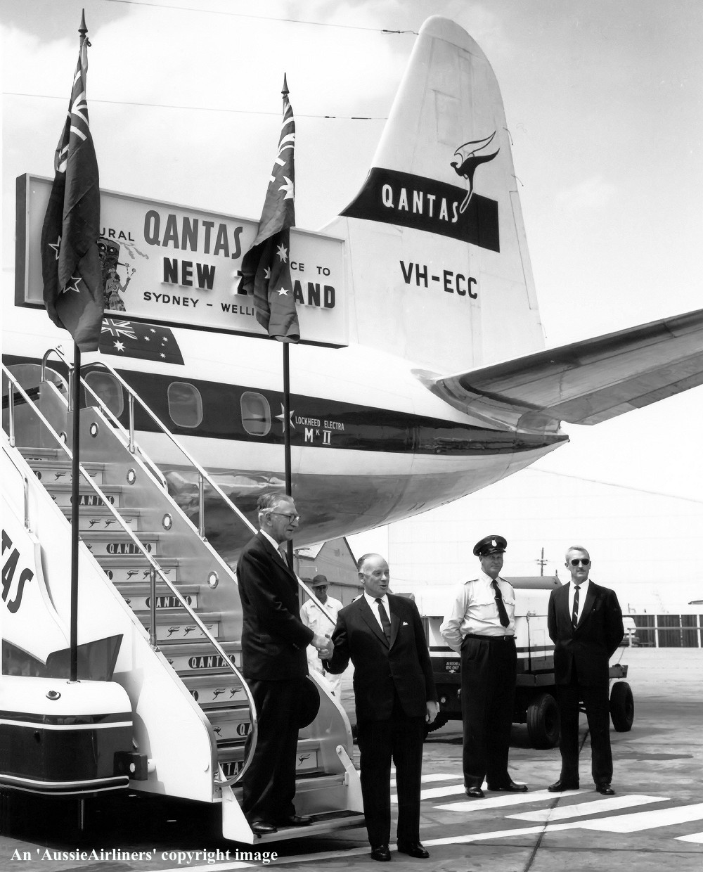 VH-ECC. Qantas Australia's Overseas Airline - 'Pacific Endeavour' in the original livery at Sydney Kingsford Smith Airport, October 03, 1961. This was the inaugural Sydney - Wellington service. On the steps, left to right, Sir Hudson Fysh and Mr S. C. Johnston (New Zealand High Commissioner). (Qantas Heritage Collection Copyright Image 1808-860.) |
